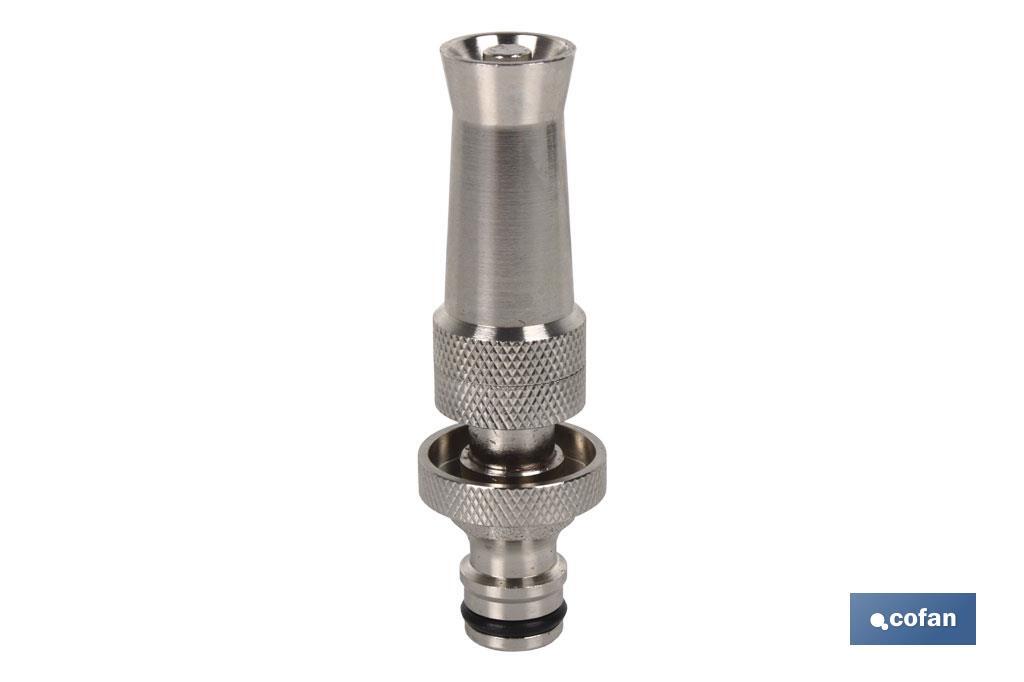 Boquilha de latão ajustável para mangueiras de jardim. Podes conectá-lo a qualquer mangueira rapidamente com um conector de encaixe rápido. A sua união segura com a mangueira permite-nos poupar água e uma boa impermeabilização. É muito fácil de adaptar e usar graças ao seu sistema de rosca. Fabricado em latão de elevada qualidade proporcionando-nos durabilidade, resistência e garantia de uso. É ideal para uso em exteriores. Adapta-se rapidamente ao tipo de rega que necessitas. É muito cómoda e funcional.