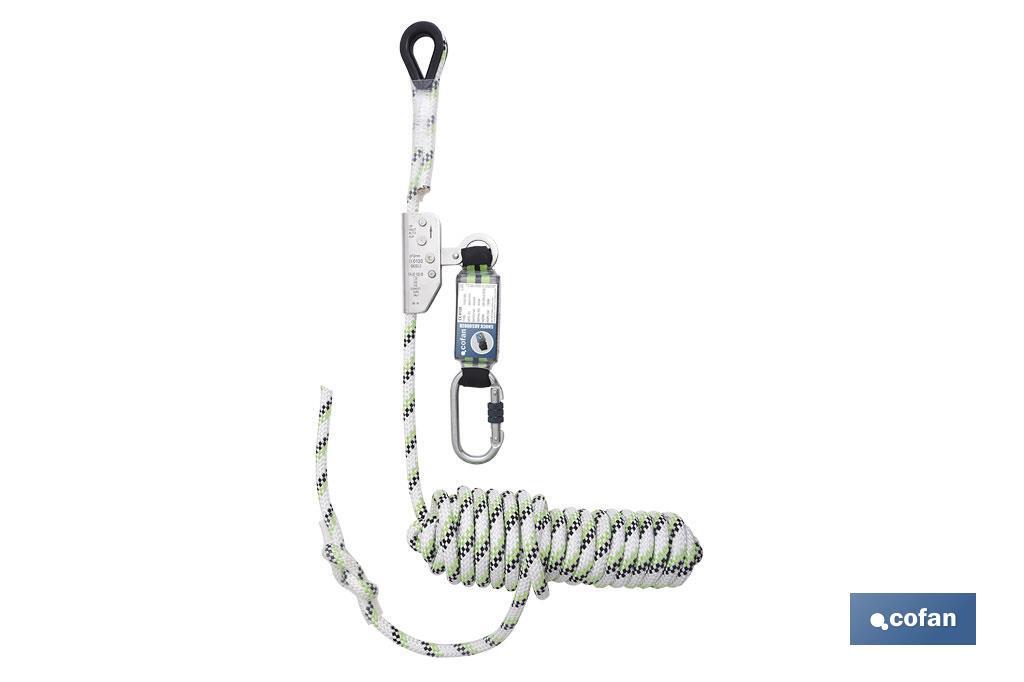 Antiqueda Deslizante Corda Trançada de 10 m. Sistema de abertura/fecho simples e bloqueio automático duplo, com dispositivo anti inversão. Costura protegida com bolsa transparente que permite o controle visual.