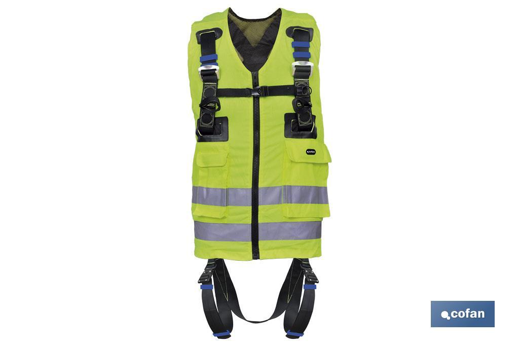 Arnés anti-queda com colete de trabalho amarelo de alta visibilidade, dois pontos de fixação no peito, um ponto de fixação esternal composto por duas fivelas de tecido, uma argola D dorsal para o sistema anti-queda e dois laços automáticos.