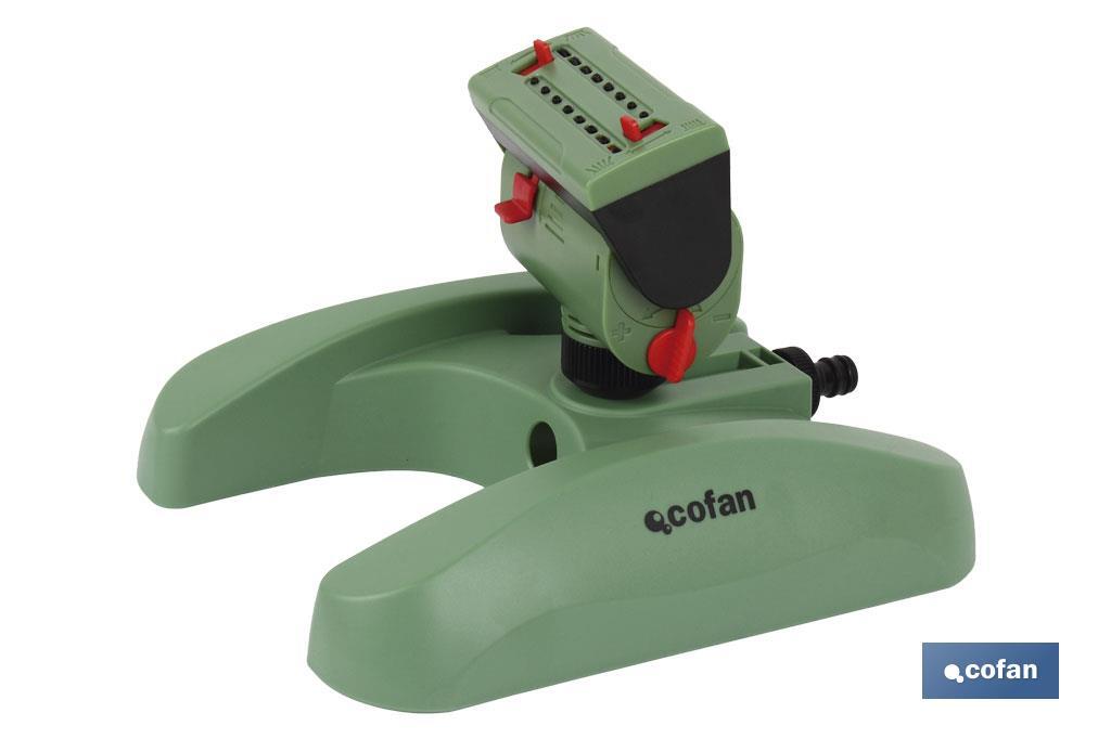 Aspersor de rega oscilante multifuncional com 16 saídas ajustáveis em direção e intensidade. A sua cobertura é ajustável em comprimento e largura. A base deste produto é de plástico, resistente a choques, arranhões e impactos. A cobertura máxima de irrigação deste aspersor é de até 366 metros quadrados. Este produto é ideal para tarefas de rega e manutenção em jardinagem e agricultura. As conexões internas do aspersor são resistentes e compactas, o que torna este sistema de rega um método confiável e seguro para o jardim. Permite regar de forma eficaz e otimizada graças à sua cobertura de rega otimizada.