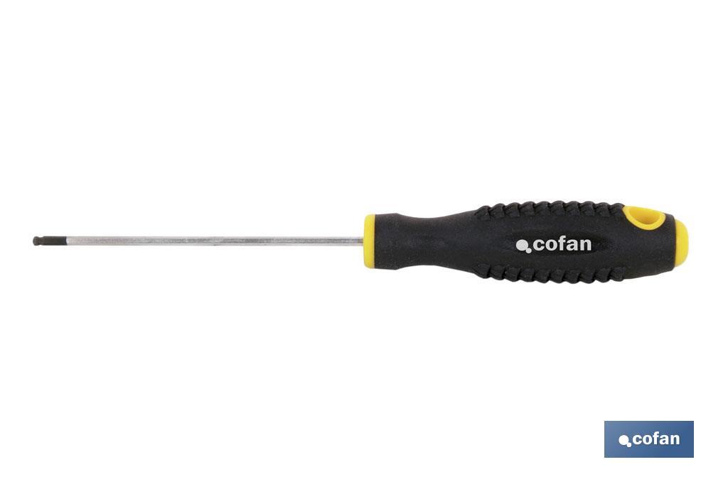 Chave de fenda Allen, ponta esférica, modelo Confort plus. Medidas do H-2 ao H-10, comprimento máximo 32cm.