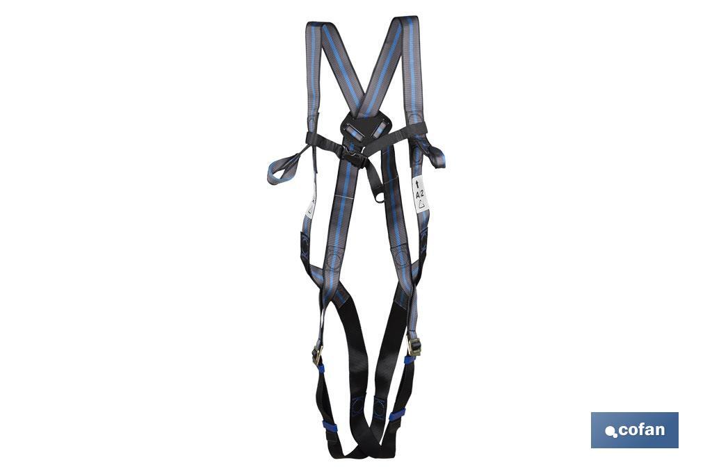 Arnés antiqueda com duas cores para diferenciar as coxas e ombros, ajustaveis e com correia de assento idónea para uma maior ergonomía e comodidade do utilizador. Dois pontos de engate: esternal/dorsal. O conjunto nclui: 1 arnés com 2 pontos de fixação, 1,5 m de corda diâmetro Ø12 mm com resistência à rotura de 22 kN, 2 mosquetões de aço de bloqueio com parafuso e 1 Mochila para guarda-lo. Com absorvedor de energía.