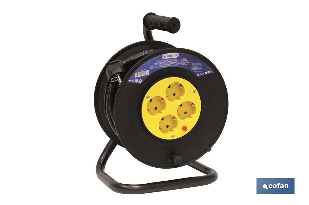 Alargador de cabo elétrico com quatro tomadas ou fichas e 25 metros de comprimento. Tambor prolongador fornecido com comutador de seguranças por sobrecarga, segurança para crianças. Prolongador, enrrolador de cabo de 25 metros de comprido e secção de 3 x1,5 mm.