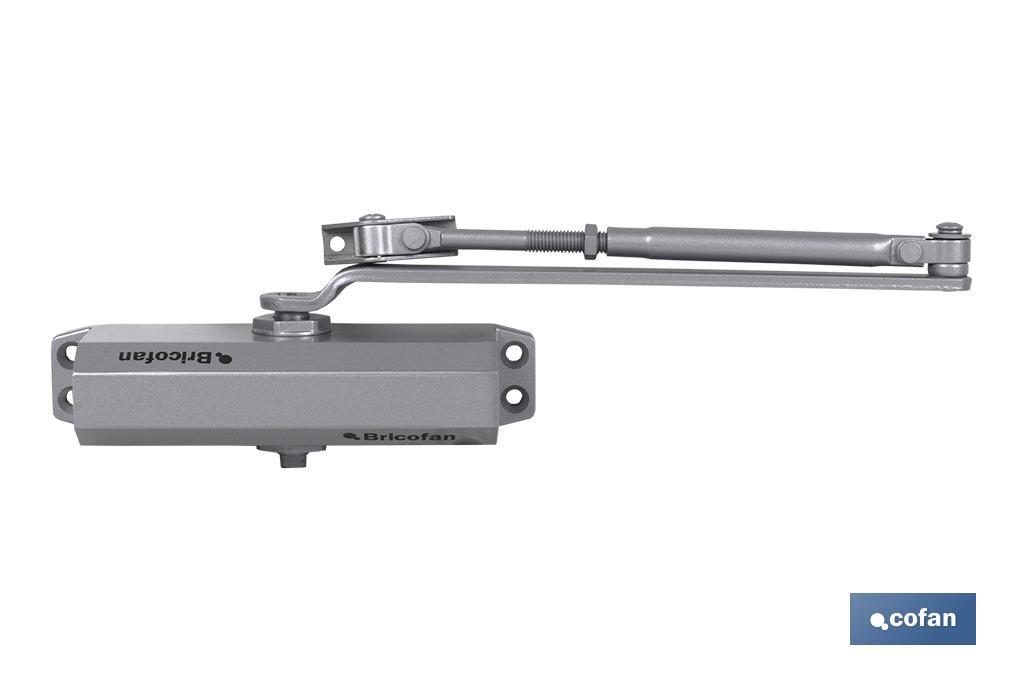 MOLA DE PORTA, CORPO DE ZAMACK. BRAÇO EM AÇO. MOLA EM AÇO LUBRIFICADO. VÁLVULAS DE REGULAÇÃO COM DISPOSITIVO TERMOSTÁTICO. VÁLVULAS DE SOBRECARGA MODELOS PARA PORTAS DE 65 E 85 KG.