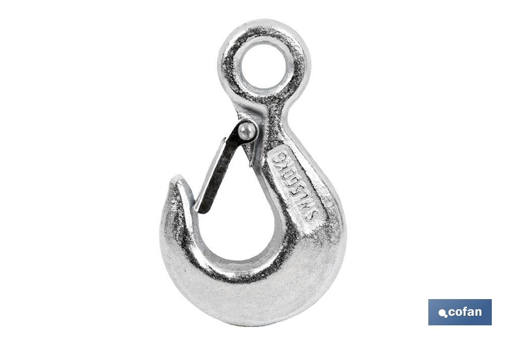 Gancho DIN-689 adequado para a elevação de cargas desde 250 kg até 2.500 kg. Com gatilho de segurança incorporado, para aumentar a segurança do gancho e evitar o retorno da carga.