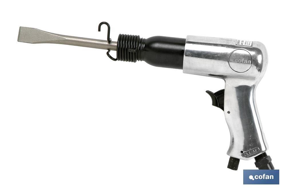Conjunto de escarpa pneumática, com jogo de 5 cinzéis, mola de retenção e acessórios de lubrificação. Estrutura durável, pois é fabricada de um material altamente resistente com um acabamento especial anti-ferrugem e anti-corrosão. É durável e forte o suficiente para suportar o uso intensivo.