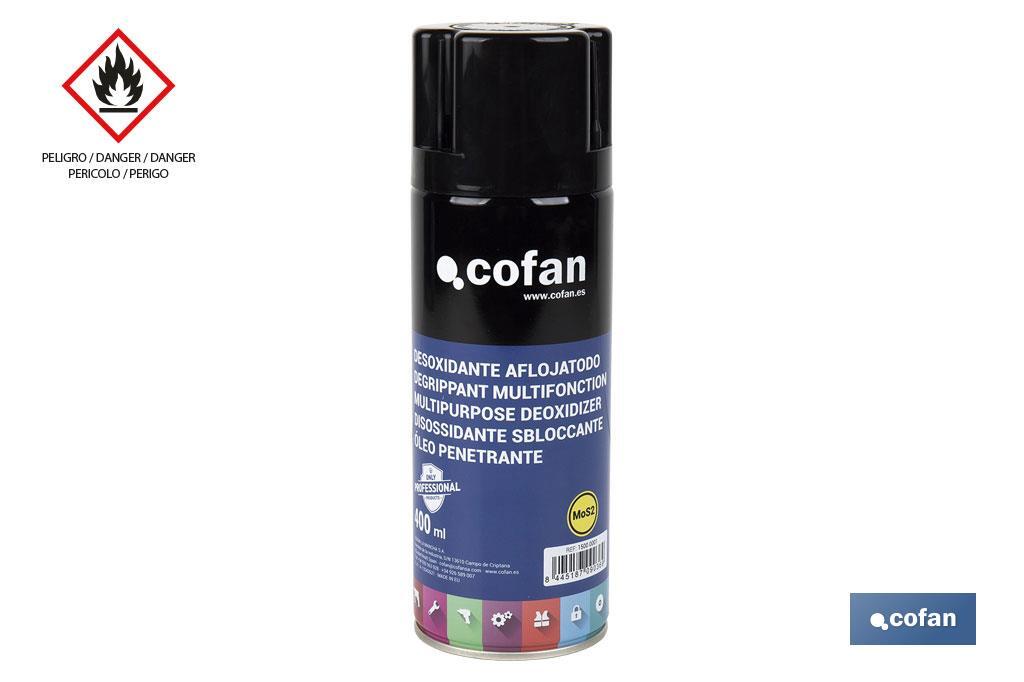 Desbloqueante desoxidante com disponibilidade de 200 ml e capacidade de 400 ml. É altamente eficaz para várias aplicações. Afrouxe tudo com MoS2 (dissulfeto de molibdénio). Spray lubrificante com propriedades desbloqueadoras, alto poder desoxidante e efeito muito duradouro. O pó de dissulfeto de molibdénio micronizado facilita o seu poder de desbloqueio e deslizamento. O pó de dissulfeto forma uma camada lubrificante com um coeficiente de atrito muito baixo e excelente adesão, mesmo sob condições extremas de pressão e temperatura. Impede processos de oxidação. Aerossol extremamente inflamável. Recipiente sob pressão: risco de explosão sob a ação do calor. Manter fora do alcance das crianças. Manter afastado do calor, superfícies quentes, faísca, chama aberta e outras fontes de ignição. Não fumar. Não pulverizar sobre chama aberta ou outra fonte de ignição. Não furar nem queimar, mesmo após utilização. Manter ao abrigo da luz solar. Não expor a temperaturas superiores a 50 °C/122°F.