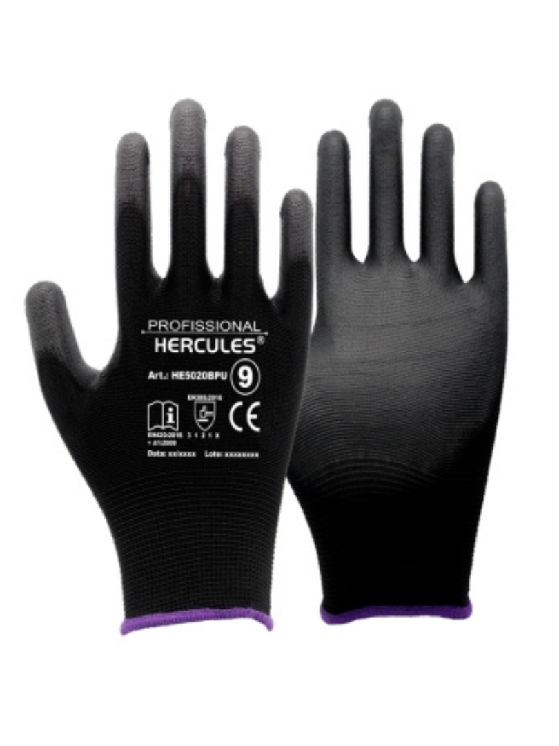 Luva com revestimento em poliuretano (palma) e interior em poliéster.