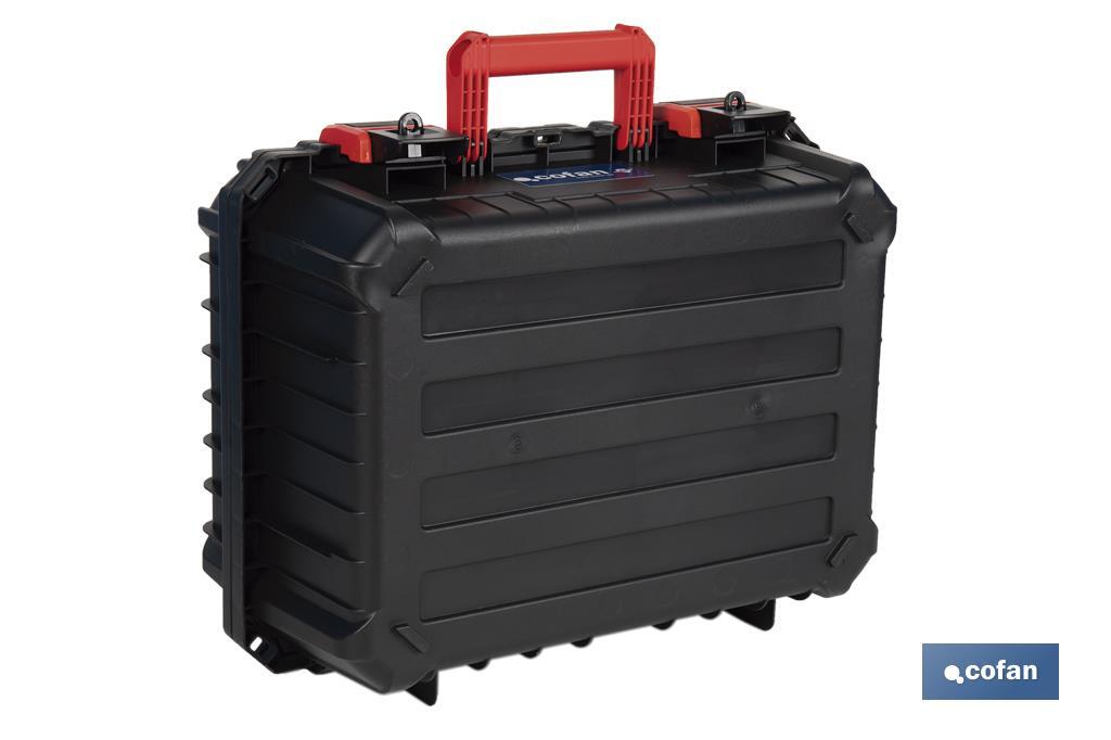 Mala para ferramentas com interior almofadado em espuma, corpo fabricado em polipropileno reforçado e pegas verticais e horizontais ergonómicas em ABS resistente e durável. Inclui fechos em ABS de alta resistência com interior resistente ao pó e à água. Espaço de armazenamento funcional protegido por espuma no interior da caixa.Ideal para armazenar e transportar máquinas eléctricas ou a bateria com todos os seus componentes. Medidas: 44,5 x 36 x 21,6 cm.