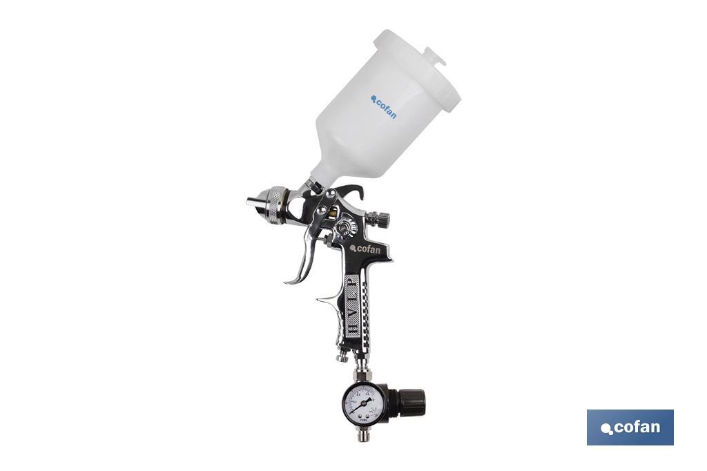 Pistola gravitacional para pintar sistema HVLP, com regulador de tinta a ar no gatilho. Inclui um regulador de pressão na entrada da pistola. Alta transferência de produto mesmo com pouca saída de ar. Fabricado inteiramente em aço inoxidável. Compatível com tintas à base de água.