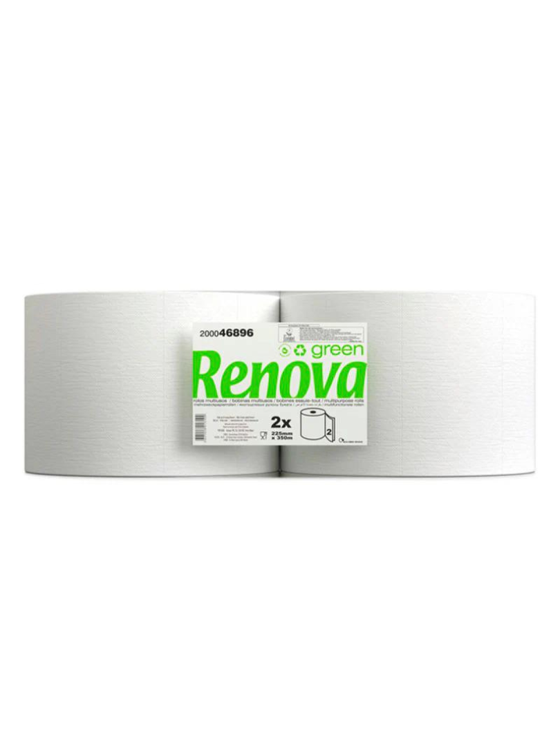 Rolo de papel industrial Renova Green com 450 metros e folha dupla. Embalagem com 2 rolos ao melhor preço.